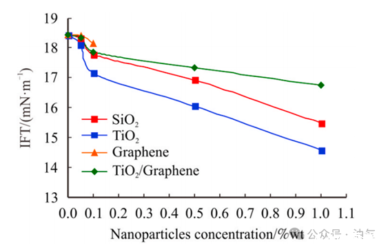 5.单独的石墨烯纳米颗粒对降低油水界面张力的影响可以忽略不计。加之其与TiO2纳米颗粒(纯TiO2纳米颗粒)合成TiO2/石墨烯纳米复合材料时,不利于发挥作用。因此,石墨烯纳米颗粒对EOR来说在操作上和经济上都不可行。