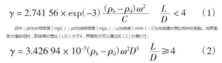 式中:ρh为水相密度(mg/L);ρd为油相密度(mg/L);ω为转速(r/min);C为与油滴长宽比相关的系数。当界面张力值较低时,即油滴长宽比(L/D)大于4,界面张力可以通过式(2)计算: