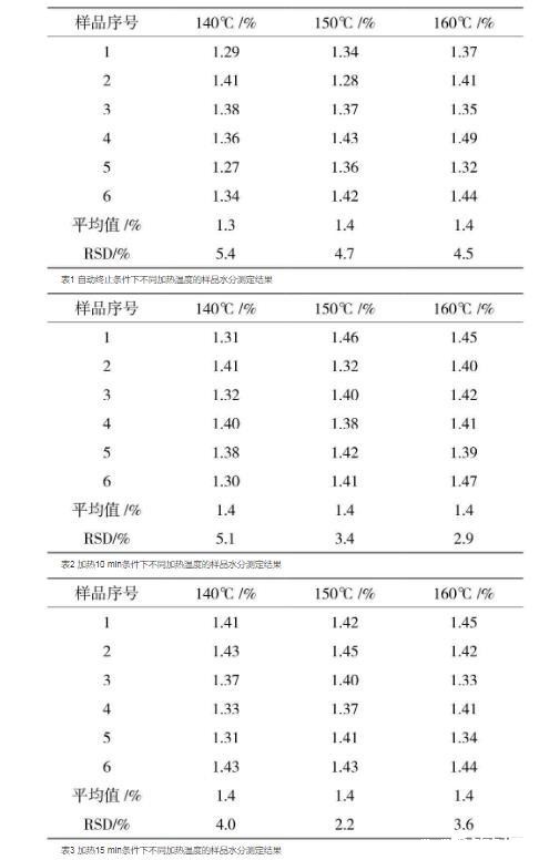 表1自动终止条件下不同加热温度的样品水分测定结果