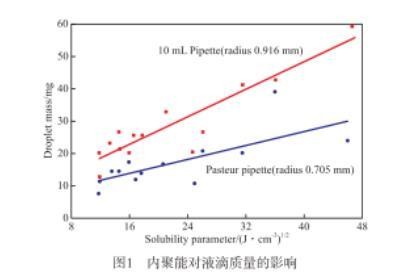 对于纯物质的溶解度参数可通过文献查阅、基团贡献计算法和液体热力学关系式计算。而矿物油为混合物,很难查到或者估算它的溶解度参数。文献提供了一种溶解度参数的估算法:称量10~20滴液体,然后计算每滴液体的平均质量;另取2种已知溶解度参数的非挥发性液体作为参照,通过做图大致计算出液体的溶解度参数。实验需保持恒温。分别通过内径为0.916 mm的10 mL移液管和内径为0.705 mm的巴斯德移液管移取液滴,得到两条溶解度参数与液滴质量的关系曲线。内聚能对液滴质量的影响见图1。由图1可见,液滴的质量与液体溶解度参数成线性关系。该估算方法可用来计算混合液体的溶解度参数,适用于矿物润滑油溶解度参数的计算。虽然估算方法过于粗糙,但为估算矿物油等复杂混合物的溶解度参数提供了思路。文献介绍了液滴的大小与液体表面张力有关。由此可见,溶解度参数与表面张力存在一定的关系。