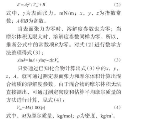 只要通过已知化合物计算出式(3)中的x,y,z,A,就可通过测定表面张力和摩尔体积计算出混合物质的溶解度参数。由于混合物的摩尔体积无法直接测出,可通过测定密度和估算平均摩尔质量的方法进行计算,见式(4):