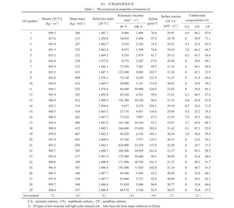29种常见的低芳浅色矿物油:取自国内主要炼油厂的润滑油基础油,包括主要的石蜡基基础油和环烷基基础油,不包括深色高芳烃矿物油;从精制程度看,包括高压加氢深度精制油品,也包括溶剂精制和白土精制工艺精制油品;从碳型结构看,包括芳环碳(CA)含量为零的油品,也包括CA含量小于10%(w)的油品。矿物油的理化性质见表1。