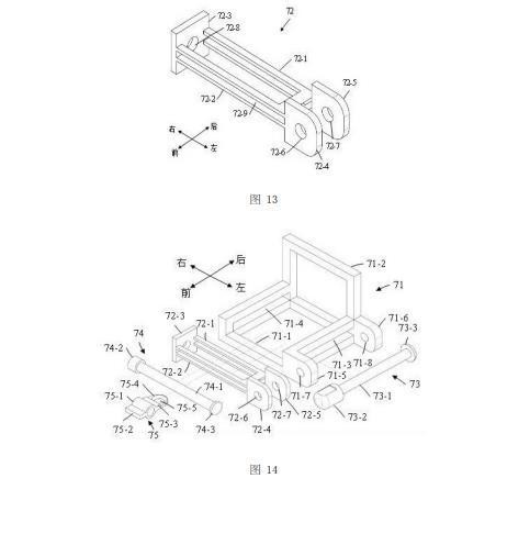 如图13所示,滑动座72包括第一U形板72-1、第二U形板72-2、盖形板72-3、第一尾板72-4、以及第二尾板72-5。第一U形板72-1和第二U形板72-2的开口端都与盖形板72-3的左侧面(即里侧面)固定连接,并且第一U形板72-1和第二U形板72-2均与盖形板72-3相垂直,其中盖形板72-3沿竖直方向延伸且盖形板72-3上设置有通孔72-8,第一U形板72-1和第二U形板72-2均沿水平方向延伸;第一U形板72-1位于第二U形板72-2的上方,第一U形板72-1与第二U形板72-2相互平行且二者之间设置有一个缝隙72-9。在本实施例中,第一U形板72-1与第二U形板72-2相同。