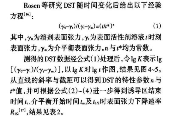 其中,γ0为溶剂表面张力,γt为表面活性剂溶液t时刻表面张力,γm为介平衡表面张力。n与t*均为常数。