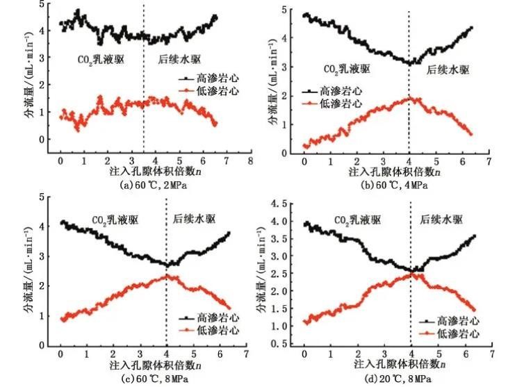 CO2乳液的强度越高、界面黏弹性越好,其分流效果也会越明显。从图10(a)可以看出,在注入CO2乳液过程中,高渗岩心出口端产液量逐渐降低,低渗岩心出口端产液量逐渐增加,但是增加幅度很小,低渗最高分流量约为1.3 mL/min,这说明该实验条件下CO2乳液能够起到一定的分流作用,但是分流效果较差。对比图10(a)、(b)、(c),相同温度下,随着压力的升高,CO2乳液的调剖分流效果越来越明显,低渗岩心的分流量从1.3 mL/min升至2.3 mL/min,说明压力的升高有利于CO2乳液的调剖分流,可应用于深井和超深井等高压条件的CO2乳液调剖分流。