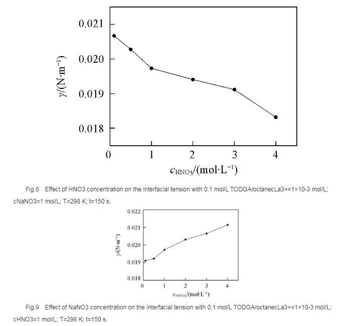 以电解质NaNO3作为离子强度变量,考察了NaNO3浓度变化对界面张力的影响。结果(图9)表明,界面张力随着NaNO3浓度的升高而增大,这是由于随着NaNO3浓度的升高, TODGA在界面上聚集的稳定性降低,降低了其溶解性,增大了界面张力;同时会增强对金属离子的萃取能力,减少界面上游离的萃取剂分子数,使界面张力增大。