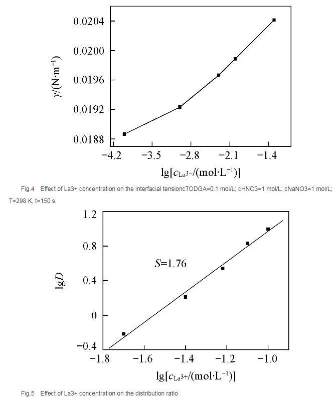在相同水相条件下,测定了萃取剂浓度对分配比的影响(图5),根据斜率法得到萃合物的组成为La(NO3)3·2TODGA.位于界面区域的萃取剂与金属离子形成萃合物,界面区域游离萃取剂分子减少,导致体系的界面张力增大。