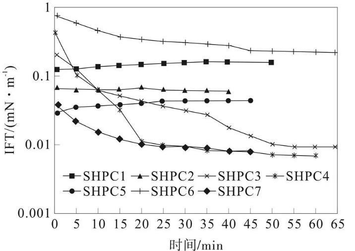 将SHPC1~7活性体系溶液配制为浓度大小为0.25%的溶液,密闭24 h,然后利用Texas-500C界面张力仪对界面张力进行动态测定,从而得到图2所示的结果。