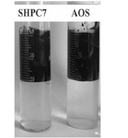 为验证SHPC7活性剂与其他表面活性剂的性能,通过乳化实验对SHPC7活性剂与AOS活性剂在乳化方面的乳化性能进行观察,从而可以得到如图3的实验前后效果。