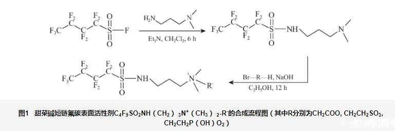 图1甜菜碱短链氟碳表面活性剂C4F9SO2NH(CH2)3N+(CH3)2-R-的合成流程图(其中R分别为CH2COO,CH2CH2SO3,CH2CH2P(OH)O2)