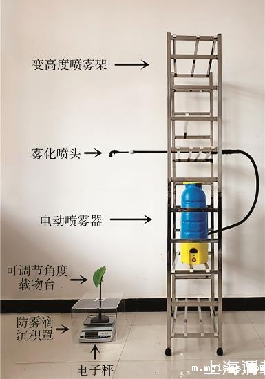 流失点和最大稳定持留量的测定装置见图2。将喷雾器固定在可变高度喷雾架上,喷头与地面垂直,分别设置喷嘴下沿与叶片中心垂直距离50、100、150和200 cm 4种喷雾距离,喷雾器中装入水,进行喷雾时关闭静电功能。测定装置由载物台、电子秤和防雾滴沉积罩3部分组成。其中载物台可进行90°以内的倾斜角度调整;电子秤精度为0.01 g(YH-50002型,东阳市英衡智能设备有限公司);防护罩为透明的亚克力材料制成,防止雾滴沉积到电子秤上。