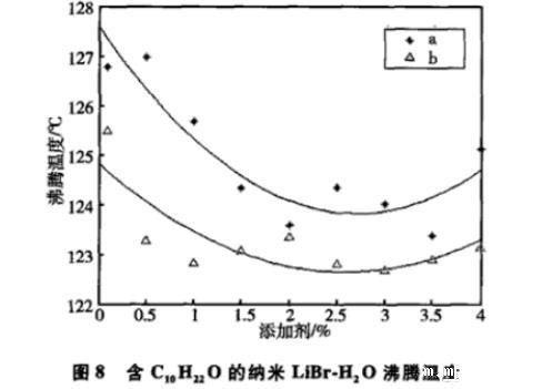 图8是含表面活性剂C10H22O的纳米LiBr——H2O沸腾温度,从图中可发现沸腾温度随着添加剂浓度的增加有先降低后增加的趋势。