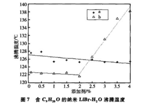(2)实验中将一定浓度的表面活性剂与纳米Li——Br——H2O混合时是采用体积比1:1混合的,且由于表面活性剂在溶液表面的富集作用,导致混合时带入LiBr——H2O中的水含量不同,从而引起LiBr——H2O浓度的改变,导致沸点升高。