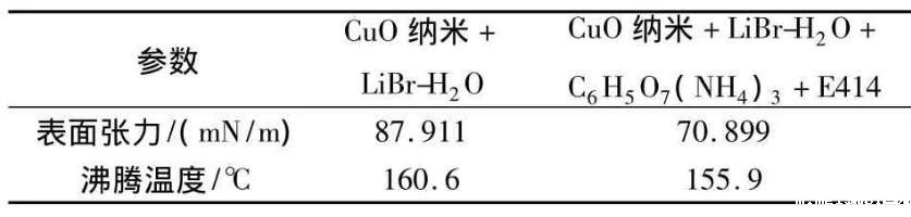 为了便于观察3种表面活性剂对纳米LiBr——H2O表面张力和沸腾温度的影响,实验测量了不含此3种表面活性剂的纳米LiBr——H2O的表面张力和沸腾温度,见表1。