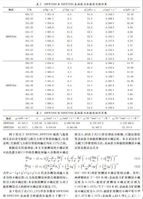 本文对HFE7000和HFE7200在饱和状态下293.17~393.00 K和293.27~393.35 K温度区间的表面张力和黏度进行了实验研究,结果列于表2。