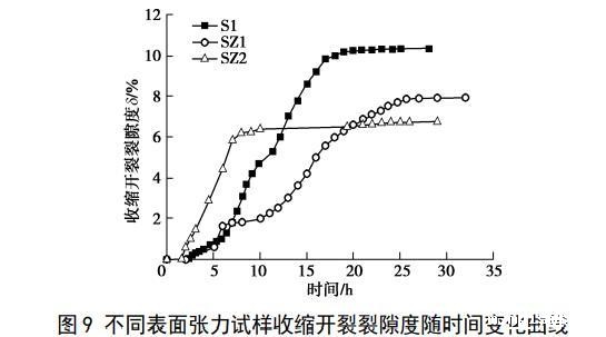 图9为不同表面张力下试样收缩开裂裂隙度随时间的变化关系曲线,从图中可以看出,土样收缩裂隙发展基本分为3个阶段,第一阶段为土体收缩开裂酝酿阶段,此时试样刚开始蒸发失水,失去的水分主要为土体表面的孔隙水,此阶段中土体表面没有产生收缩开裂。第二阶段为收缩开裂迅速发展阶段,此阶段土体表面收缩开裂迅速发展直到进入第三阶段:收缩开裂稳定阶段,此时随着试样脱湿时间的增加,收缩开裂裂隙度基本不再发生变化。SZ2样最先进入收缩开裂稳定阶段,稳定时的收缩开裂裂隙度为6.7%,SZ1样最后进入收缩开裂稳定阶段,其最终收缩开裂裂隙度为7.9%,S1样进入收缩开裂稳定阶段的时间则介于二者之间,试样的最终收缩开裂裂隙度为10.3%。很显然,孔隙液体表面张力越小的试样,试样最终收缩开裂裂隙度越小,但在土体表面裂隙发展阶段,相同的脱湿时间,孔隙水表面张力小的试样其收缩开裂裂隙度有可能大于表面张力较大的土样。
