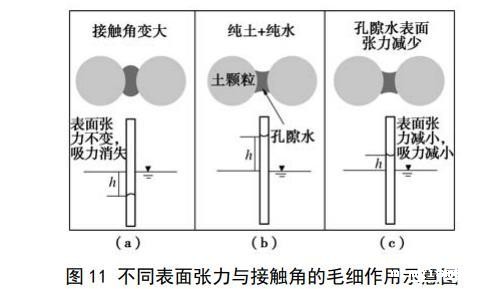 3.1接触角和表面张力抑制膨胀土裂隙发育的机理分析从前面的试验可知,减小孔隙水表面张力或增大土颗粒与孔隙水间的接触角都可以抑制膨胀土的干缩开裂,然而,增大接触角对膨胀土收缩开裂的抑制效果明显好于减小孔隙水表面张力。结合图11的颗粒模型和毛细管模型对其机理进行分析。当土颗粒间由液桥连接时(对应于非饱和土中的水封闭状态),其基质吸力为1 21 1r r。(3)式中为液体的表面张力,r1和r2是任意一对相互垂直的平面在液面上所截取曲线的曲率半径,当曲率中心在液体侧时其值为“负”,反之为“正”。设为“正”时表示吸引,为“负”时表示排斥。传统的非饱和土力学中,基质吸力都大于零,不会是负值。这是因为:在岩土工程领域中,通常把岩土体都视为完全亲水性材料,即孔隙水与土颗粒的接触角为0,即使在模型计算时所涉及的接触角也是比较小的,这种情况下基质吸力只可能为正,即:非饱和土中只存在负的孔隙水压力。