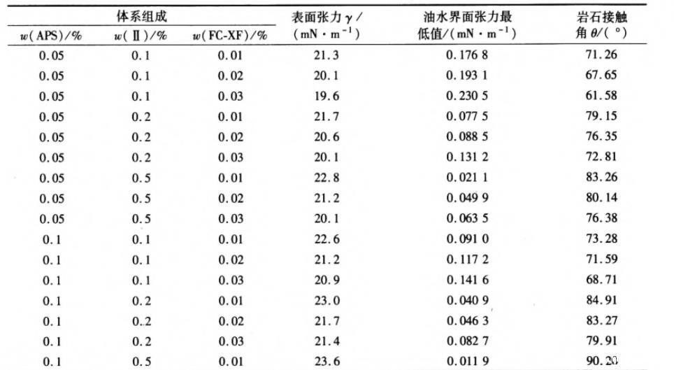 表1体系组成和含量对APS/Ⅱ/FC-XF混合体系界面性能的影响