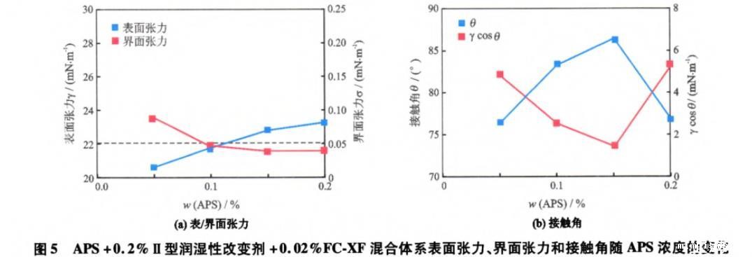 从图5(a)中可以看出,随着APS质量分数的增加,体系的表面张力增大,界面张力减小,这与FXCF对表/界面张力的影响机制相同。从图5(b)中可以看出,随着APS质量分数的增加,体系与岩石的接触角先增加再减小,相应的γcosθ先减小再增大,均出现极值点,这与图4(b)的变化趋势不同。这是因为吸附Ⅱ型润湿性改变剂和FC-XF使得岩石表面由水湿转变为弱亲水性润湿(接触角<75°),更易于吸附APS的亲水头基而使碳氢链在岩石表面暴露,这降低了岩石表面的亲水性,因而随着APS质量分数的增加接触角增大。但是,当APS质量分数大于0.15%后,过多的APS分子可能在岩石表面发生双分子层吸附或因竞争吸附而降低Ⅱ型润湿性改变剂的吸附量,使得岩石表面的亲水性增加。而且,接触角的变化决定了γcosθ的变化趋势,因而接触角和γcosθ随APS质量分数的变化曲线中均出现极值点。