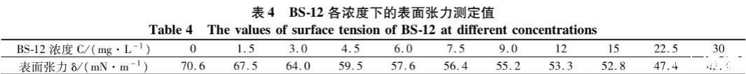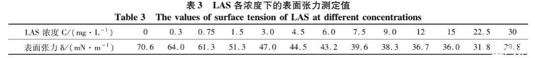 LAS是应用最广泛的阴离子表面活性剂,是我国合成洗涤剂活性物的主要构成,可用作洗衣粉、香波、金属清洗剂、脱墨剂等产品的原料,分析其生物降解性能十分必要。LAS试样在不同浓度时测定的表面张力结果见表3。