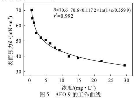 脂肪醇聚氧乙烯醚(AEO-9)是一种非离子表面活性剂,该类表面活性剂是非离子表面活性剂中发展最快、用量最大的品种。AEO-9试样的表面张力测定结果见表5。
