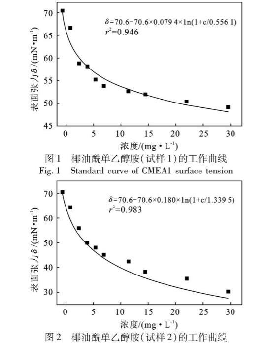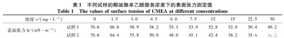椰油酰单乙醇胺溶液的表面张力测定结果见表1。