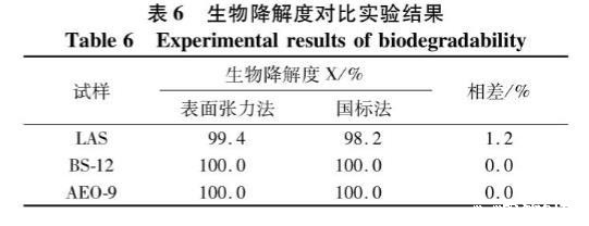 对比两种方法得出的生物降解度,由表6可知,表面张力法计算得出的生物降解度比国标法测定的结果偏高或者一致,两者相差小于2%,可认为两种方法均可测定表面活性剂的生物降解度,其结果均可信。