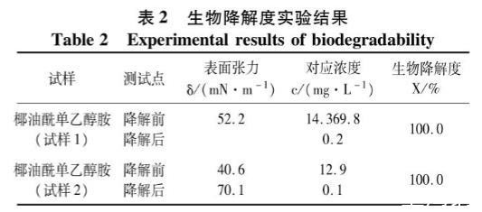 不同批次的椰油酰单乙醇胺试样经过降解后利用表面张力法测定其降解液的表面张力值,根据生物降解度公式计算得出降解度,测定结果见表2。其中空白降解试验液降解前与降解后的表面张力值分别是69.5、68.2mN/m,而试样溶液在降解后测定的表面张力值均大于空白降解试验液降解后的表面张力值68.2mN/m,导致带人工作曲线计算出的降解后试样溶液的浓度(c终)小于降解后空白降解试验液的浓度(c空),根据公式要求,当c终小于C空时,差值以零计,因此最终计算出的生物降解度为100.0%。
