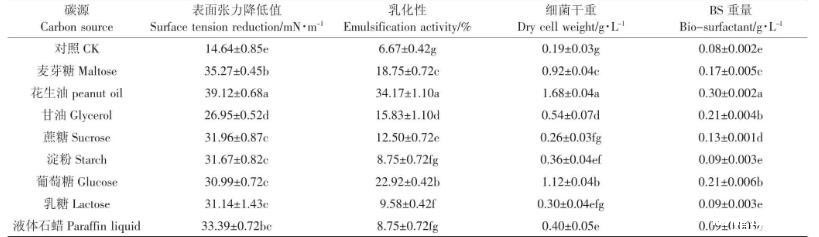 表3碳源对147细菌生长以及生物表面活性剂产量的影响