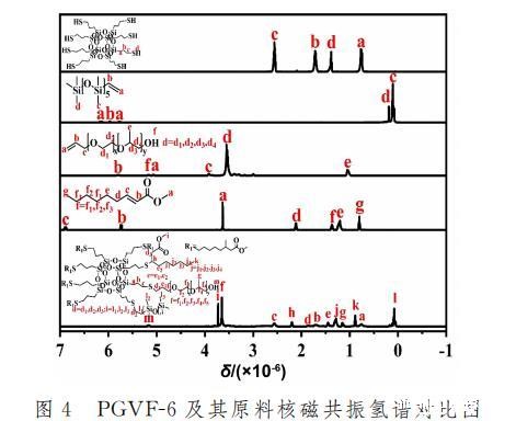 图4为PGVF-6以及其原料的核磁共振对比图。PGVF-6谱图中,SH-POSS上的-SH质子氢吸收峰已经消失,接枝成功的APEG750单体,烯烃双键的质子氢吸收峰已经消失,末端连接的-OH质子氢吸收峰在5.21times 10^{-6}处;同样反应成功的2-壬烯酸甲酯单体,烯烃双键的质子氢吸收峰也同样消失不见,连接O的末端烷烃-CH3质子氢吸收峰处于3.72x10-6的位置,末端烷烃-CH3的质子氢吸收峰在0.88x10-6处;最后成功反应的VDMS单体,烯烃双键的质子氢吸收峰也已经消失,后续Si上连接的所有甲基-CH3分别处在0.12x10-6和0.08x10-6处,可以得知PGVF-6杂化材料成功合成。