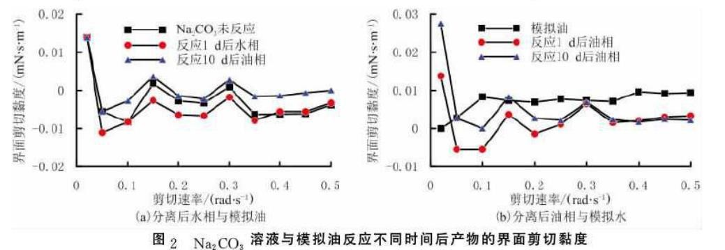 在Na2CO3溶液与模拟油反应1d和10d后,分离得到的水相与模拟油及油相与模拟水的界面剪切黏度随剪切速率变化关系见图2.由图2可以看出,Na2CO3溶液与模拟油反应1d及10d后,分离得到的水相与模拟油的界面剪切黏度,与未反应Na2CO3溶液与模拟油的界面剪切黏度相比变化不大;模拟油与Na2CO3溶液反应1d及10d后,分离得到的油相与模拟水的界面剪切黏度与模拟油与模拟水间的界面剪切黏度相比变化不大,表明Na2CO3溶液与模拟油反应后分离出的水相和油相对油水界面剪切黏度影响不大。原因是模拟油中的有机酸组分与Na2CO3溶液反应所生成的,无论是水溶性还是油溶性的界面活性物质均较少,在油水界面处的吸附不足以引起油水界面剪切黏度的变化。