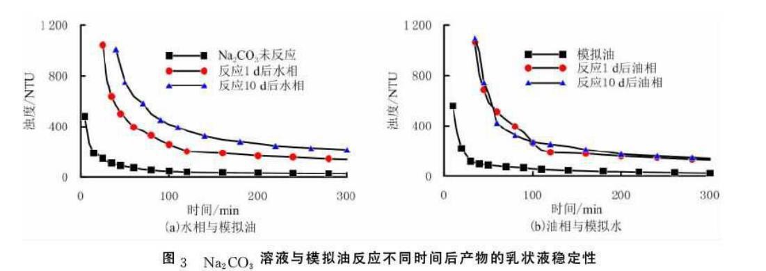 (3)与Na2CO3溶液与模拟油乳化所形成的乳状液相比,Na2CO3溶液与模拟油反应后的水相与模拟油形成的乳状液的稳定性增强。与模拟油与模拟水乳化所形成的乳状液相比,Na2CO3溶液与模拟油反应后的油相与模拟水形成的乳状液的稳定性增强。
