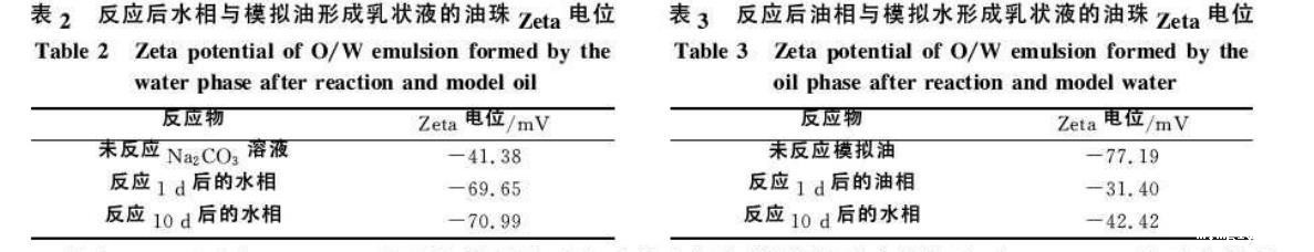 由表2可以看出,Na2CO3溶液与模拟油反应后的水相与模拟油形成乳状液,与Na2CO3溶液和模拟油直接乳化形成的乳状液相比,油珠Zeta电位绝对值明显增大;反应10d的与1d的相比,变化很小。这是由于Na2CO3溶液与模拟油反应后生成一些界面活性物质溶于水相中,电离后带负电荷,与模拟油乳化时,带负电荷的界面活性物质吸附在油珠表面上,使油珠表面带更多负电荷,从而使油珠Zeta电位绝对值增大。随着反应时间的延长,生成的界面活性物质逐渐增多,油珠Zeta电位绝对值也继续增大,但增大的幅度很小。