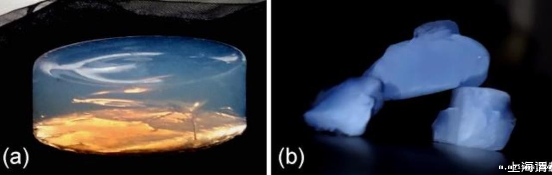 图1氧化硅气凝胶照片:(a)逆光照片;(b)顺光照片