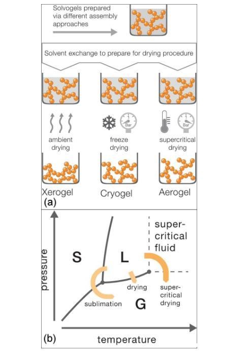 将湿凝胶中的液体转变为气体,同时维持骨架结构和体积不变(或较少变化),是气凝胶制备的另一个核心步骤。如图5(a)所示,常用的干燥方法有三种:(1)常压干燥(ambient pressure drying,简称APD),得到体积收缩巨大、高密度、孔洞极少的干胶(xerogel)。(2)冷冻干燥(freeze drying),得到体积较少收缩的冻干胶(cryogel)。(3)超临界流体干燥(supercritical liquid drying,简称SCLD),得到体积和结构都较少变化的气凝胶。