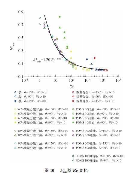 如表1所示,文认为hmin仅与Re相关。从图9中甘油溶液和PDMS硅油的曲线可以看出,二者Re相近,hmin几乎相同,与已有结论一致;但对于We相近、Re相差较大的水和镓基合金,二者也有相似的hmin.因此,hmin是否仅与Re相关,需要进一步探讨。