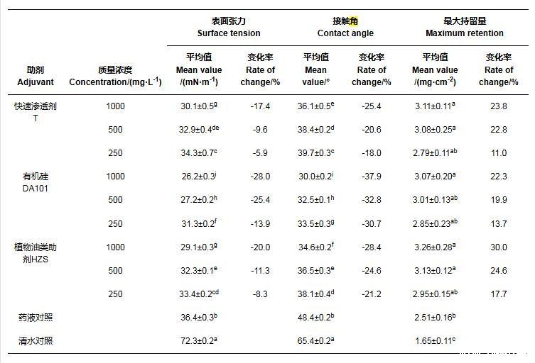 2.1添加喷雾助剂后药液理化性质(表面张力、叶面接触角)的变化