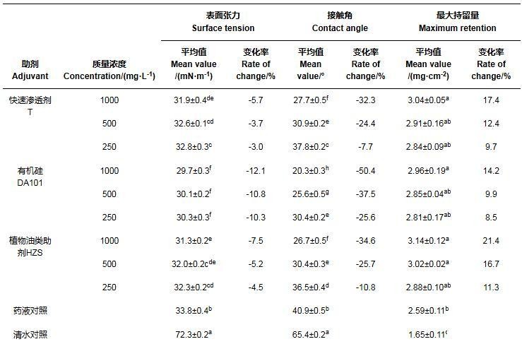 表1添加3种助剂后22.4%螺虫乙酯悬浮剂药液表面张力、叶面接触角和最大持留量的变化