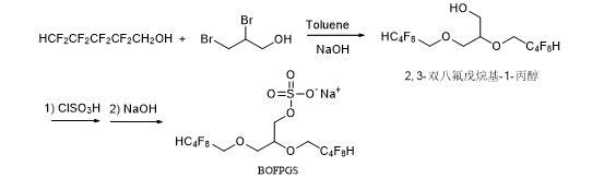针对以上难题,本文以八氟戊醇、2,3-二溴丙醇和氯磺酸为原料,经醚化和磺化两步反应合成了2,3-双八氟戊烷基甘油醚-1-硫酸酯钠(BOFPGS),通过醚键使两条八氟戊醇链与2,3-二溴丙醇连接,得到了与甘油醚类似的结构,研究了其表面张力、乳化性质以及细胞毒性,以期得到一种高表面活性、无毒且有一定应用价值的氟碳表面活性剂。