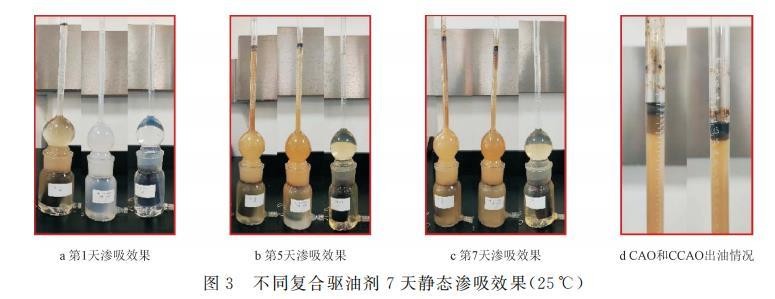 通过对静态渗吸效果的跟踪发现,CAO和CCAO对中黏度原油表现出较好的渗吸效果,分别析出0.55ml(其中2/3为乳状液,实际含油约有0.14ml)和0.30ml(均为纯油)。原因是CAO和CCAO含有单萜萜类化合物C,它具有与油相中重质组分相溶的特性,提升了低渗岩心中黏原油流动;同时,CCAO因添加了CDEA其最佳析出原油为0.30ml,且产出的原油几乎没有油水过渡层,而CAO的出油量(含油水过渡层)达到0.55ml约是CCAO的2倍,但实际纯油量只有0.14ml,仅约为CCAO的一半。