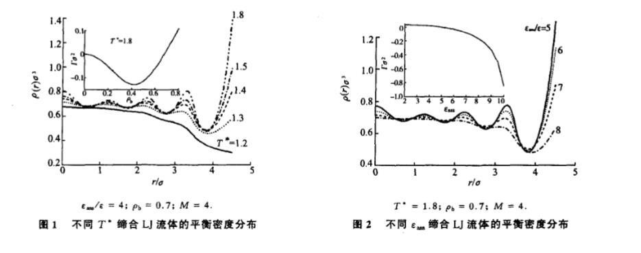 就非均匀体系而言,分子间 的排斥体积作用是使得密度呈振荡分布的主要原因。然而,图 1,2 表明 T 和 ε 也在很大程度上影响着体系平衡结构。图 1 中,密度分布曲线振荡幅度随着 T 的降低而衰减,且当 T=1.2 时,曲线的振荡趋势几乎完全消失。原因在于 T 越小,分子的无规运动能力越弱,分子间比较容易发 生缔合并形成尺寸较大的团簇结构。在平衡态下,体系的最大构象熵要求这些团簇结构向体相转移,从而导致密度分布曲线振荡趋势的削弱和接触密度的降低。然而,一旦增大 T*,分子无规运动能力的增强使得分子间很难形成稳定的缔合结构。这在某种意义上降低了分子的缔合能力,从而使分子间的排斥体积作用在更大程度上决定体系的平衡结构。
