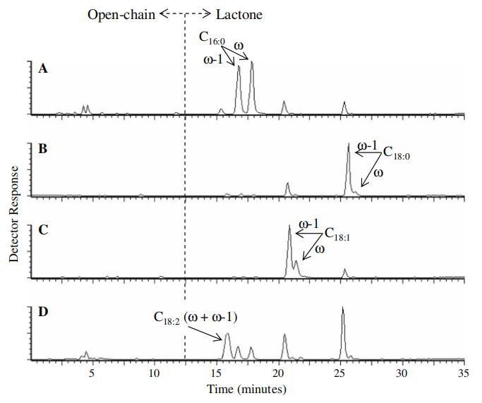 TIC(图2)中对应于含有棕榈酸、硬脂酸和油酸的SLs的峰均显示具有相同质谱的第二个峰。 根据之前报告的数据(Nun〜ez et al.2001),我们得出结论,在这两个峰中,首先洗脱的峰对应于结构变化,槐糖环的10-羟基和脂肪酸的x-1碳之间存在糖苷键,而随后的洗脱峰(通常是除SL-p外的一个次要峰) 通过糖环与脂肪酸的x碳之间的糖苷键连接。 根据APCI-MS结果,确定在每种情况下,无论底物如何,超过92%的SL分子为内酯构象(表1)。
