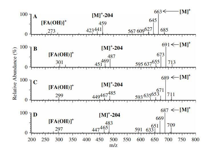 图3正大气压化学电离(APCI)-来自图2中每个TIC色谱图基峰的质谱图。 图2的TIC中的C16:0二乙酰化槐脂内酯(RT=16.7分钟)、图2的TIC中的C18:0二乙酰化槐脂内酯(RT=25.2分钟)、图2c的TIC中的C18:1二乙酰化槐脂内酯(RT=20.7分钟)和图2d的TIC中的C18:2二乙酰化槐脂内酯(RT=15.8)。 ([M]+=质子化分子离子;[M]+-204=质子化分子离子-减去乙酰化己糖(质量204);[FA(OH)]+=质子化羟基脂肪酸)