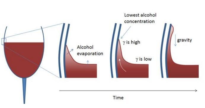 水由于强有力的氢键的存在,使得其表面张力极强。正是由于表面张力的存在,因此葡萄酒和杯壁交界处有一个薄薄的弯月面,它的存在加上表面乙醇的蒸发,使得此处水的占比较大,因此具有较大的表面张力。而酒内部的乙醇浓度较高,表面张力较小,因此与弯月面处形成了一个表面张力梯度,从而内部的酒逐渐向弯月面移动,弯月面处的酒逐渐变多,逐步形成一个个小酒滴。但当酒滴大到一定程度时,由于重力作用,它便会滴下来,这就是“酒泪”现象了。