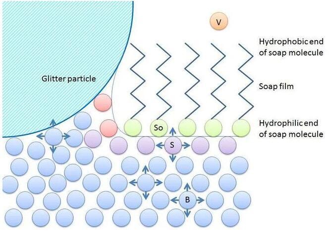 而水和乙醇的比例直接使得液体的表面张力发生了变化。液体的表面张力是由于表层的液体分子之间的作用力远大于液体-空气的吸引力所导致。而表层的水分子之间的吸引力使得水与空气的交界面具有收缩的吸力,这就表现为了液体的表面张力。
