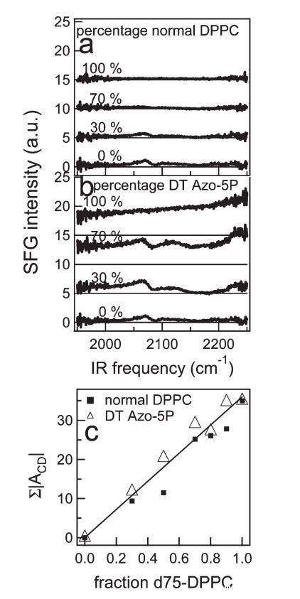 图9:。(a)正常DPPC和d75 DPPC不同混合物的CD区VSFG光谱。图中给出了混合物中正常DPPC的百分比。为清晰起见,光谱偏移,细线表示零。(b)与a部分类似,但适用于DT Azo-5P与d75 DPPC的混合物。(c)通过拟合VSFG光谱获得的CD振动振幅之和,如文中所述,作为含正常DPPC或DT Azo-5P的二元混合物中分数d75 DPPC的函数。在本实验中,为了获得混合物的高质量数据,红外注量很高,导致通过VSFG光谱中相对较高的CH2和CD2振幅观察到的脂质尾部出现小的无序。