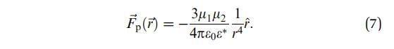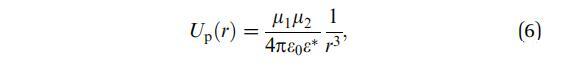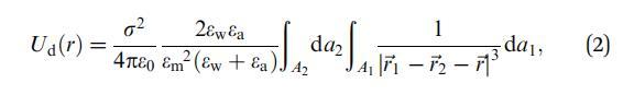 其中Ai表示域i的面积,dai表示其面积元素,-ri表示其相对于域中心的位置向量,i=1,2-r是从域1中心到域2中心的向量,如图1所示。e0是真空介电常数,ew和ea分别是水和空气的相对介电常数。在这里,我们使用了Urbakh等人21的研究结果,该研究描述了由两个半无限介质包围的薄电介质层中偶极子之间的相互作用。