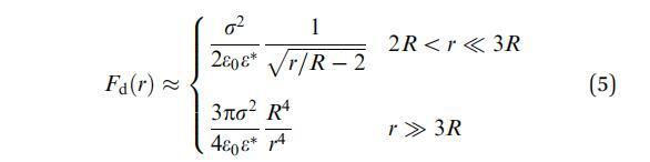该力沿中心线分布,其大小仅取决于域之间的距离r。Fd(r)没有解析表达式,因此必须进行数值计算。然而,对于单分散系统的特殊情况(所有域半径等于R),Wurlitzer等人22发现该力的渐近行为为: