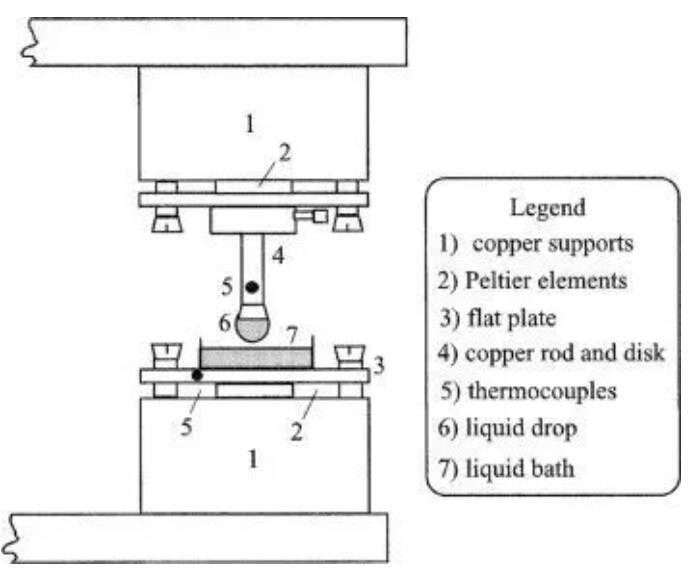Monti后来和同事们做了这样一种装置,上面的仪器悬挂着一滴液体,下面是同样液体形成的水平液面。