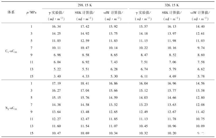 表1 C1-nC10和N2-nC10混合物在298.15 K、326.15 K下的纳米孔中测量和模型预测的界面张力(IFT)